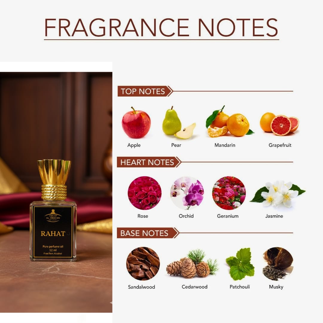 A fragrance that begins with the crisp freshness of fruits, blooms into romantic florals, and finally settles into warm woody notes. RAHAT is pure perfume oil—free from alcohol, long-lasting, and unforgettable.
